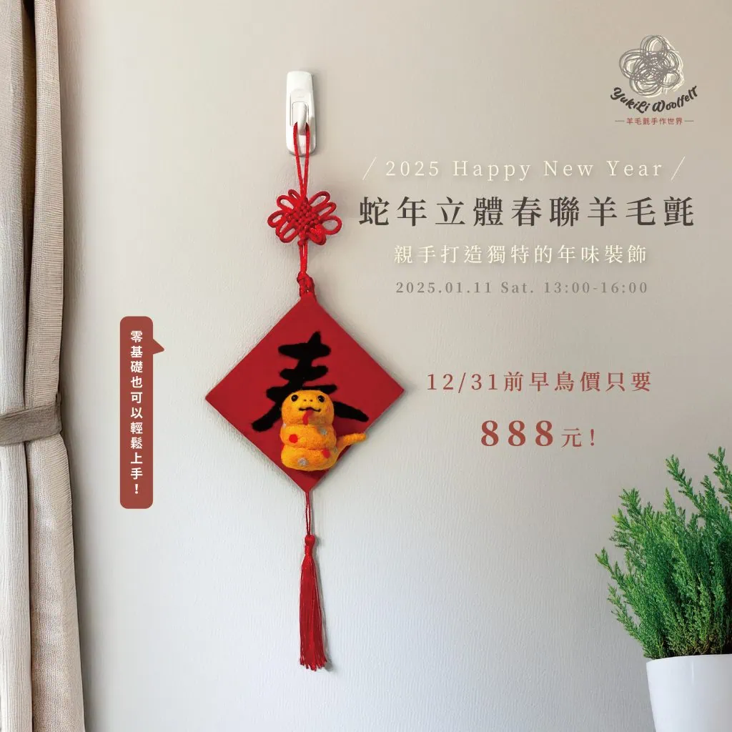 手作教室 手作教室|2025.1.11 蛇年立體春聯羊毛氈🐍【已截止】 by Yuki Li 2024/12/02 Yuki Li 2024/12/02 2.9K 2025蛇年限定課程來啦!✨將福氣滿滿的春聯結合超萌立體羊毛氈福蛇🐍一起創造新年專屬的祝福飾品🎉!課程零基礎友好輕鬆上手👌不僅能學到實用的羊毛氈技巧還能親手打造獨特的年味裝飾❤️!讓你的春聯更有溫度更有故事🎊裝點家中滿滿新年好運✨!快來一場充滿創意與祝福的趣味課程用雙手為自己和家人帶來新年好運吧!❤️🎊 名額有限!趕緊手刀報名起來👇 載入中… 手作教室手作課程蛇年過年 1 評論 1 評論 曾詩雲 2024/12/31 - 21:38 12/30 轉帳末五碼22580,轉1338 回覆 發表評論 取消回覆 在此瀏覽器中儲存我的姓名、電子郵件和網站記錄,以便下次評論時使用。 Δ 上一篇文章 手作教室|2024.12.07 🐕萌柴Santa🎅 X 聖誕樹趣味大變身!🎄【已截止】 下一篇文章 手作教室|松山社區大學寒假班_羊毛氈逐格動畫基礎班【已截止】 你可能會喜歡 手作教室|202... 2025/06/23 手作教室|202... 2025/05/17 手作教室|202... 2025/02/18 手作教室|202... 2024/12/24 手作教室|松山社... 2024/12/15 手作教室|松山社... 2024/12/13 手作教室|202... 2024/10/29